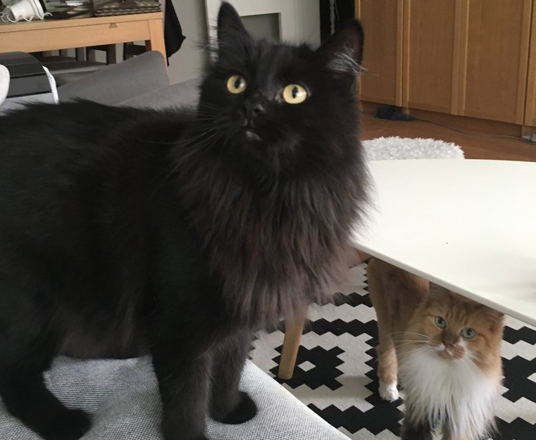 Ca. 5 kg, svart langhåret. Tufser i ørene og en hvit flekk nede på magen. Har rødt halsbånd med nametag - navn og telefonnummer.