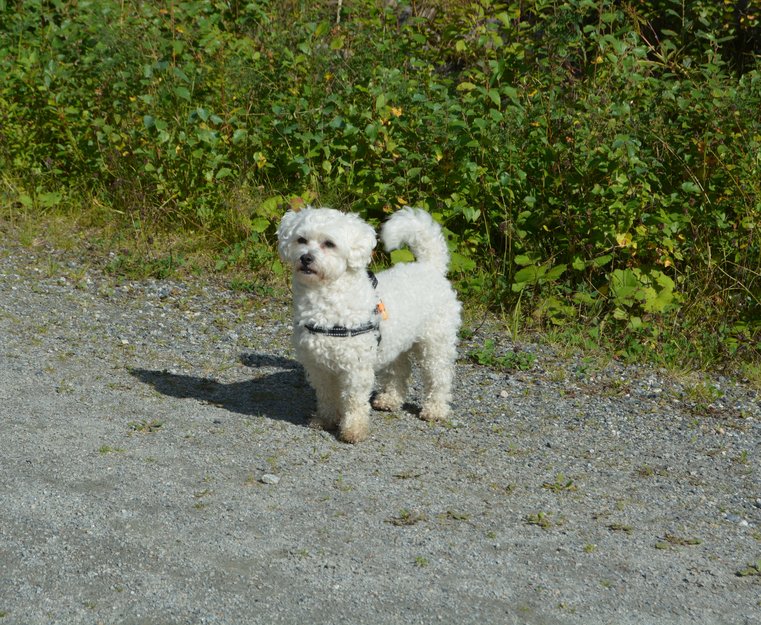 Han er en kortklippet bichon Frise. Sort sele med et hvitt blinkelys på. Han står nok på avstand og bjeffer hvis noen prøver å få tak i han.