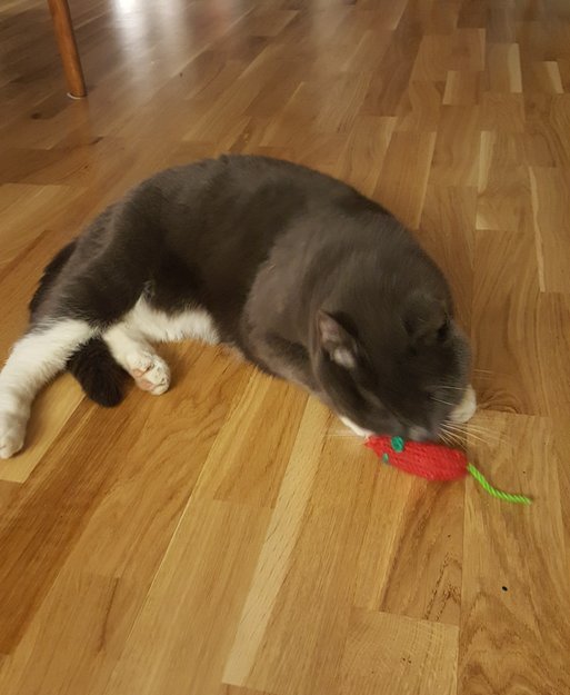 1D tatovert i øret. Rosa puter på potene. Hovedsakelig grå med hvite markeringer på poter og bryst/hake. Grå flekk under haken.