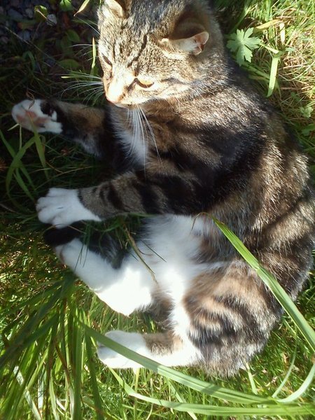 tigerstripet i svart og bruntoner. Hvite poter. ekstremt kosete og folkekjær, Tror det er en jente. Hun er ikke så stor og liker ikke løftes på.