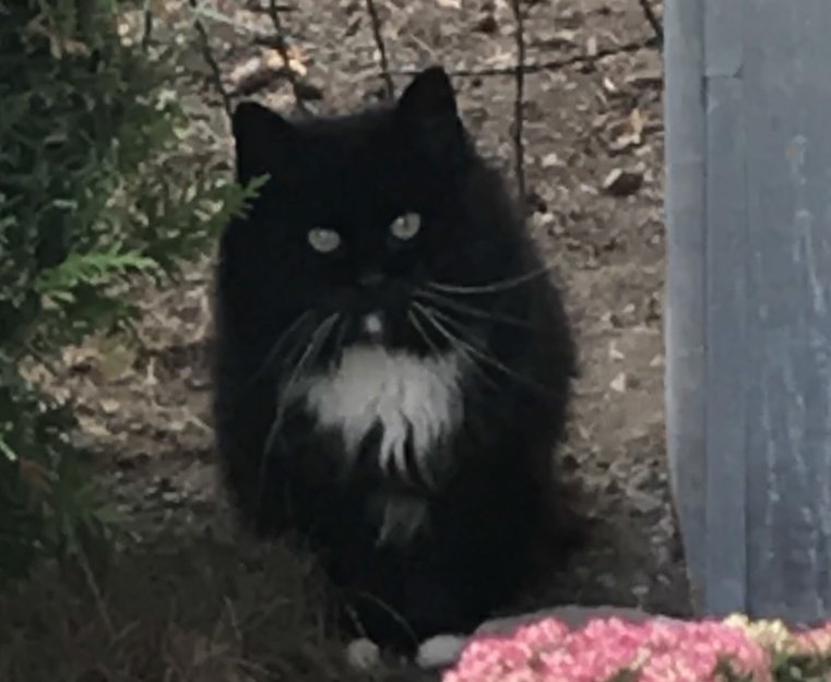 Denne katten dukket opp igjen i Bjønneroa i Hillestad i ettermiddag. Håper at noen savner denne pusen. Den var her hver dag i sommer, så forsvant den en lang periode men dukket opp igjen i går. Er veldig sky og skeptisk så ikke lett å komme innpå. Den dristet seg opp på terassen i går men så fort den fikk øye på meg gikk den unna og holdt seg på avstand etter det.