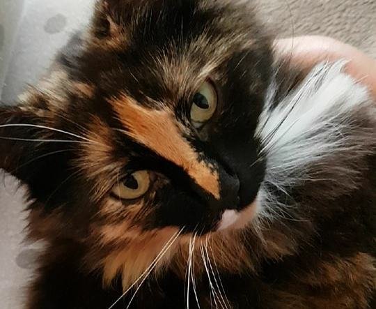 Rubi er en liten langhåret katt, hun er svart med rødt og hvit mønster i pelsen.