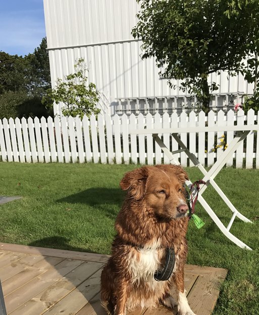 Mellomstor, gyllen, hvitt mønster, hvite labber, hvit haletipp. Brune øyne , rosa snute. Glad i folk!