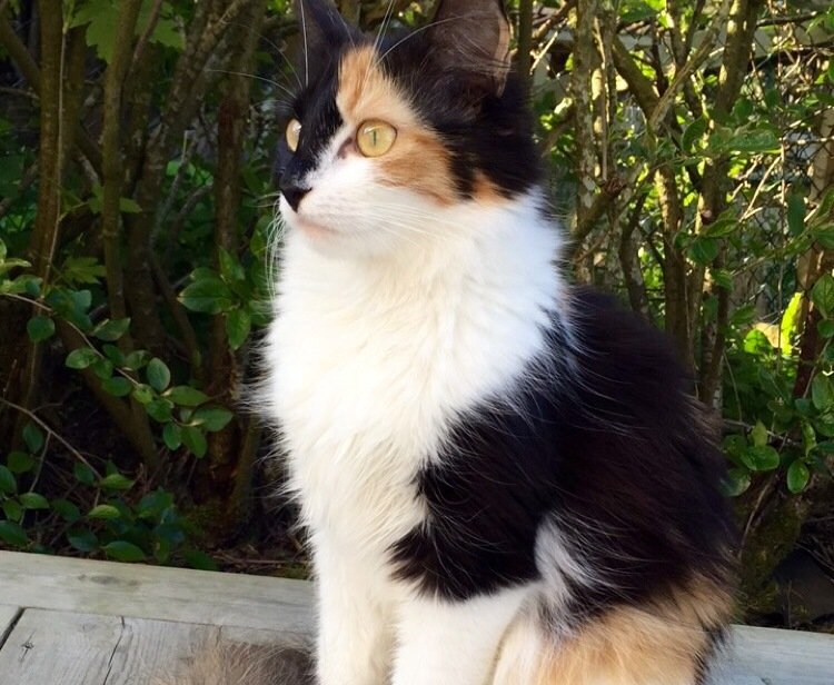 Tricolour, tydelige farger. Mye hvitt foran på mage. Halvt ansikt svart og orange.