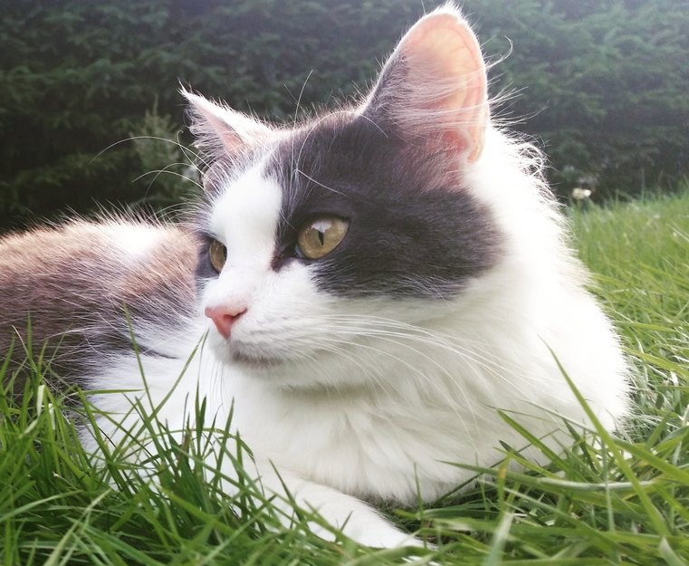 Helt hvit på underkroppen og alle poter, med gråe markeringer på rygg, hode og grå hale med hvit tupp.