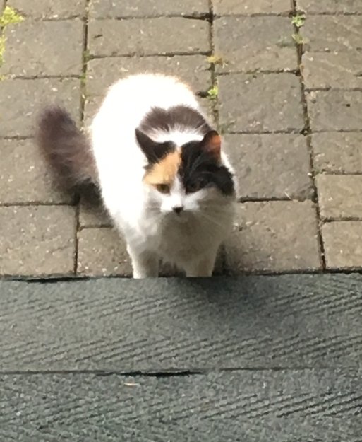 Dette er tydeligvis en ung hunnkatt som ikke har gått lenge ute. Hun ankom vår bolig/hytte, og har blitt tiltrukket av vår kastrerete hannkatt.