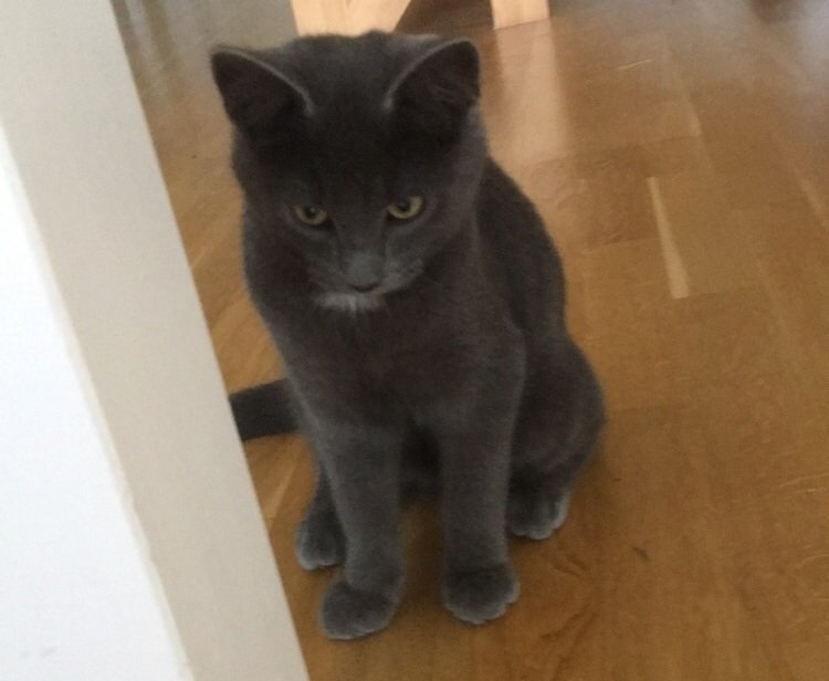 Han har en hvit flekk i brystet. Han er 5 måneder.