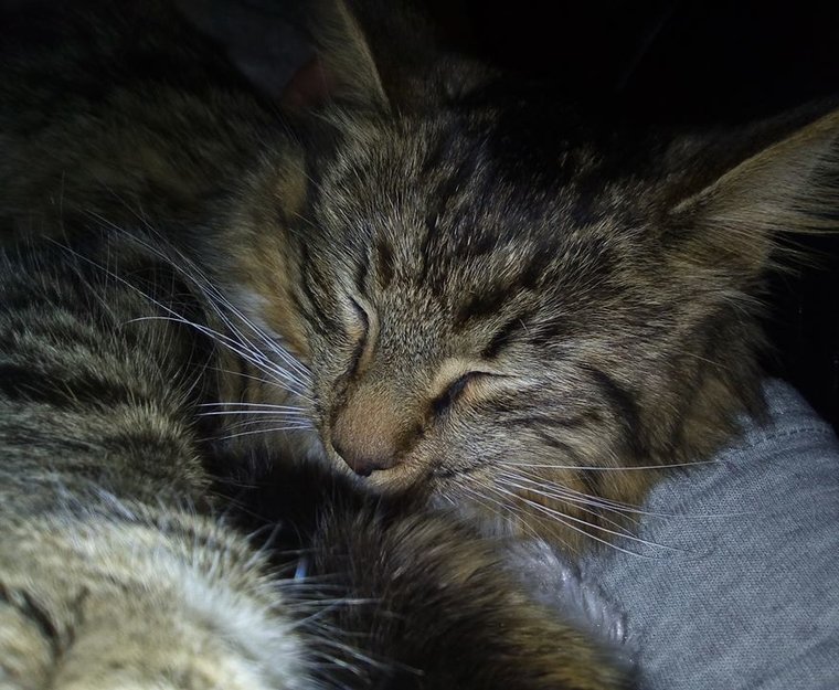 Den hoppet inn i bilen når samboer kom hjem på kvelden. Den var veldig kosete og jeg bestemte meg for og ta den inn for hun er for liten til og være ute alene. Hun er veldig liten og tynn og spiste utrolig mye. Hun har roet seg veldig men det er noen som eier henne. Blir her til vi hører noe. Går det mange mnd så beholder vi henne selv. For jeg tror at hun ikke er sterilisert, kan hende hun har blitt gravid.