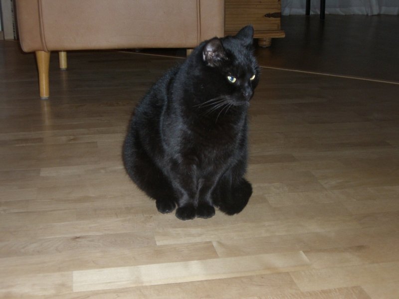 Kraftig bygget stor katt, ensfarget sort pels med et rødskjær i sollys. Noe reservert og sky. Halter av og til etter en gammel skade