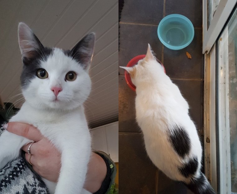 Den kom til oss da vi var ute i på tomta vår, og var desperat etter å komme inn. Vi har katter selv, og vil ikke gi mat eller slippe inn katter som ikke hører til hos oss, men den ga seg ikke. Klatret opp på terassedøren, hoppet opp til vinduet, majuet og ville desperat inn. Tynn over ryggen og alt for liten til å være ute. Satte ut vann og laget en varm og tørr plass til den ute over natta, men neste morgen var jeg nødt til å gi den mat og varme.