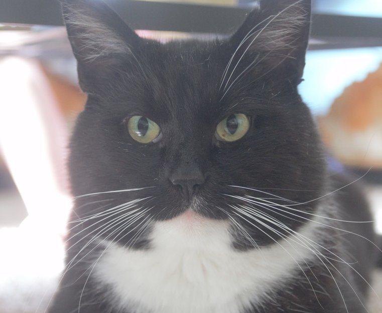 Han har hvite sokker, små kutt noen steder på ørene og hvite værhår, værhårene over høyre øye er sorte.