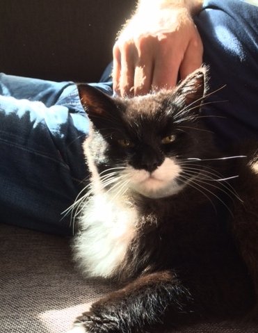 Sort langhåret hannkatt med hvitt bryst og hvite poter