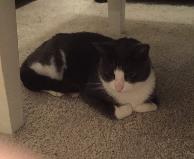 Katten er en voksen hunnkatt eller kastrert hannkatt, mørk grå med hvite partier på halsen, magen og på potene. Veldig rolig og snill.