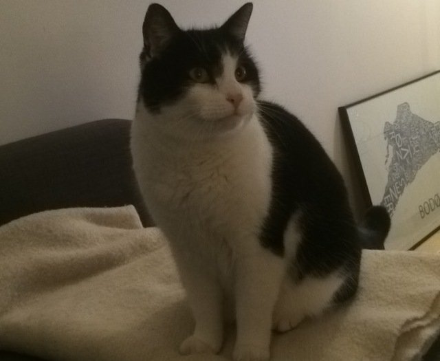 Han er sort katt med hvit mage, labber og hals, det vite går som en krage rundt hele nakken hannes, han er også hvit på snuten.