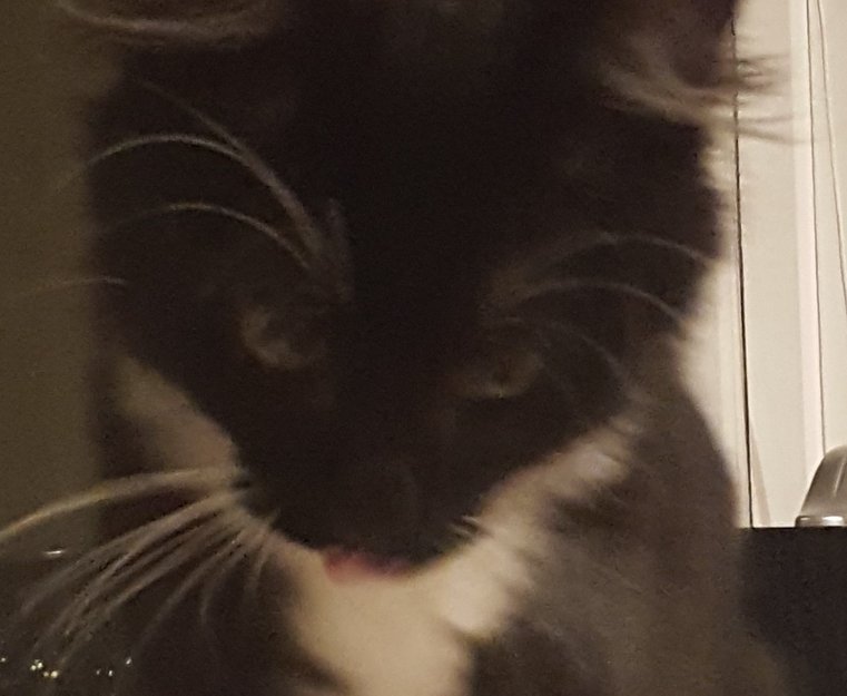 Det er ein 12-14 veker gammal kattunge, kvit frå hake til bakpotane, kvit stripe langs heile magen, samt kvite frampoter, elles svart. Den har ein lang hale, kvite fjon i øyrene. Tydeleg ikkje vill då den reagerer positivt på menneskeleg kontakt.