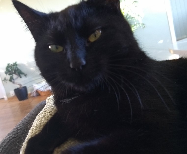Hun er en korthåret svart hunnkatt. Veldig myk pels. Hun har litt hvit pels på brystet under haka og litt hvit pels mellom lårene.