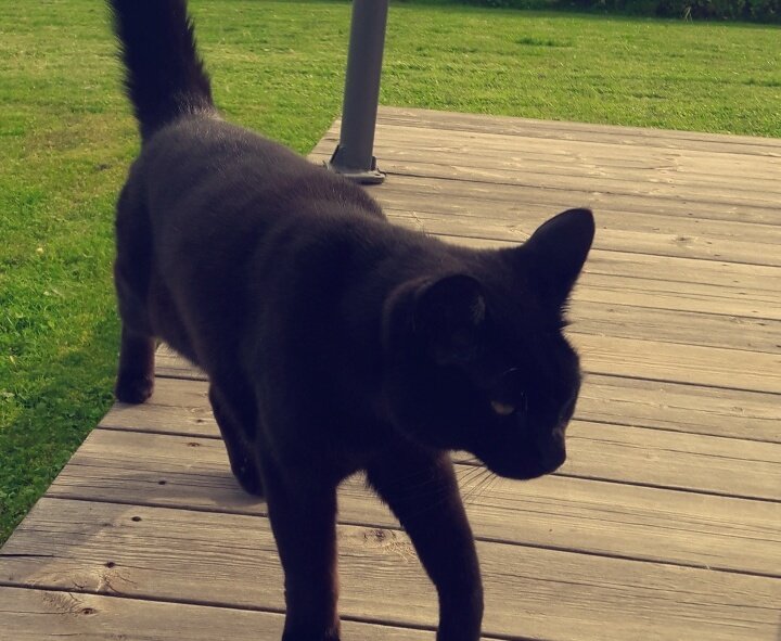 Mellomstor , helsvart , korthåra jaktkatt, men også veldig hjemmekjær! Hu er vanligvis nysgjerrig og litt skvetten men,kontaksøkende og sosial.