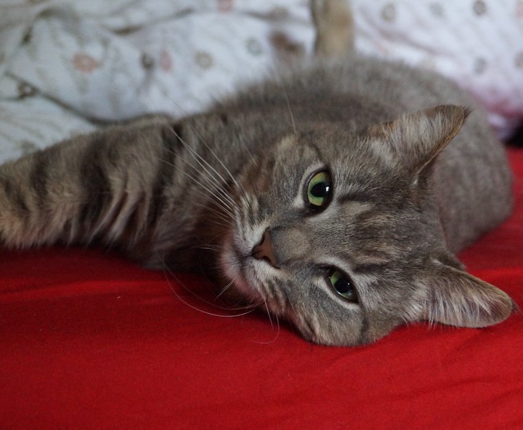 Gråtigret med krem/beige mage. I utgangspunktet er ho korthåra, men har relativt lang pels til korthåra å vera. Veldig mjuk i pelsen.