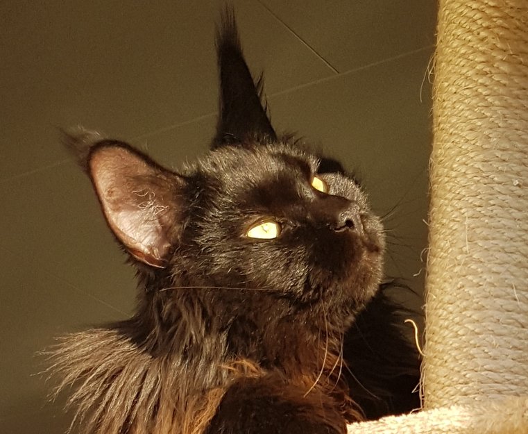 Veldig stor svart hannkatt med gule øyne. Store gaupeører med "pelstuster". Svart/brun krage rundt halsen/brystet, semi-lang pels ellers på kroppen. Lang hale med lang pels. Enkelte hvite hårstrå på halen.
