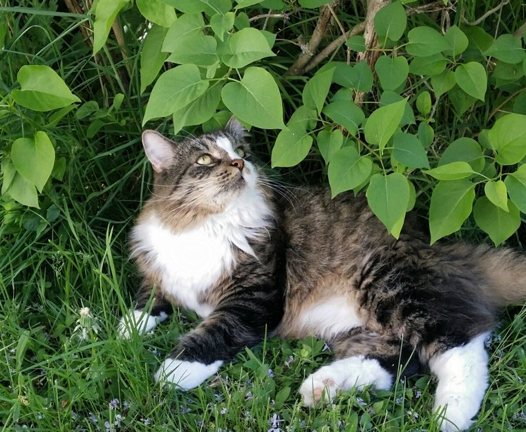 Langhåret pratsom, grønne øyne, hvite sokker og hvit krage som strekker seg under magen. Ca 6 kg, stor kastrert hannkatt. Elsker kos.