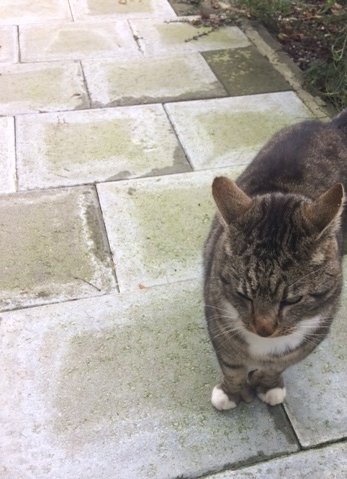 Katten har vandret rundt i nabolaget siden i sommer, greier og lure seg inn i husene her å få seg noe mat, når dørene er åpene. Håper den har et hjem og at noen savner den... Litt skremt men veldig kjelen glad i mat spiser skålene helt tomme når han får tilgang.. Store poter tommelfinger. Katten var her første gang i sommer var borte en periode kom tilbake nå i oktober.