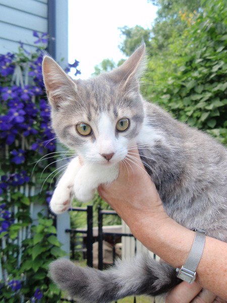 Vi hadde hengt opp bilder av kattungen. I dag gikk vi en tur i område og spurte om det var noen som viste hvem som eide kattungen. Etter en kort runde var det en som viste hvem som eide kattungen. Eieren av kattungen var reist på ferie - men naboen i rekkehuset skulle passe på katt(ene). 3 generasjoner som bodde på samme sted. Saken løste seg dermed. NOTE: I natt har kattungen ligget i fotenden av sengen til min kone - mens vår egen katt måtte overnatte ute men det gikk fint.