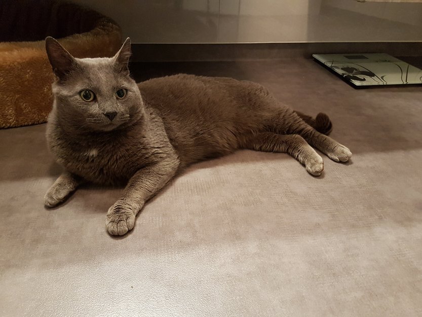 Grå med hvit flekk på brystet. Kastrert hannkatt. Chippet, men chippen er ikke registrert. Vært i området rundt Kirkås et par måneder. Eier etterlyst i lokalavisa uten treff.