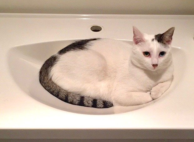 Hun er hvit med grå/sorte flekker. Halen er grå og sort stripete. Hun har et svart øre og et hvitt. Hun har et blått øye og et grønt øye.