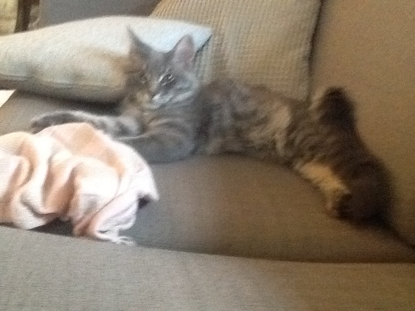 Den er som på bildet bare noe større. Den hadde et blått halsbånd som sikkert har falt av nå. Litt spisse ører og store labber til å være 6 måneder.