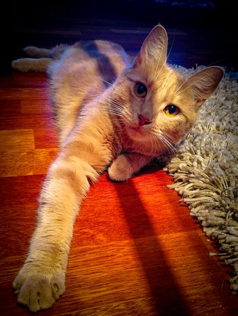 Veldig vennlig og leken katt. Spiser helst alt han kan få tak i.