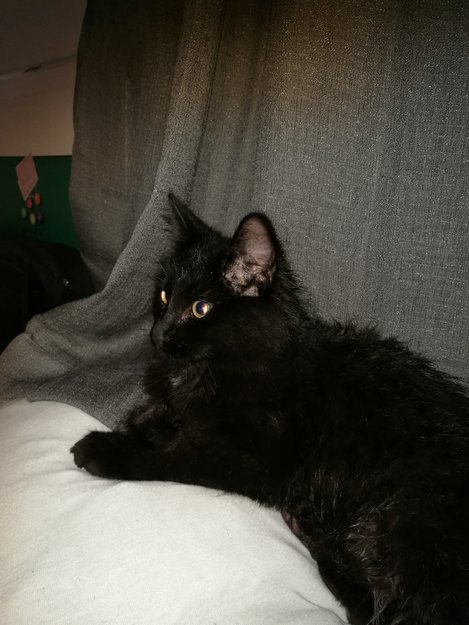 Sort kattunge med bittelitt hvit på bryst. Semi/langhåret silkemyk pels. Flott lang hale. Kontaktsøkende. Trolig en kattunge utifra tenner og utseende. Har fremdeles kattunge tenner.