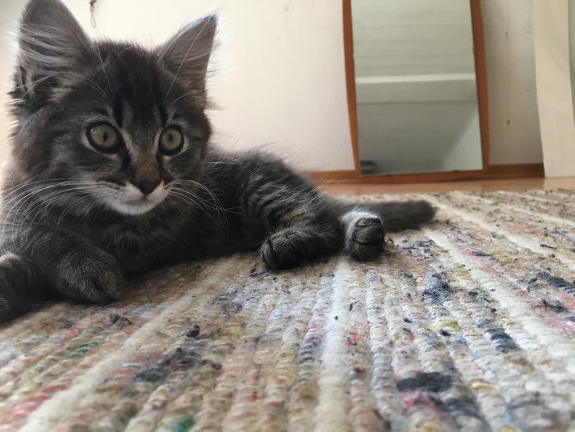 Katja er 9-10mnd og ikke veldig stor. Hun er hvit, grå og lys grå med hvite lange hår på ørene. Litt engstelig type, redd for biler og hunder.