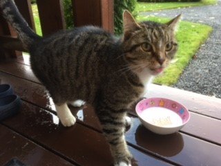 Katten har dukket opp rundt huset vårt og nabohusene de siste par ukene. Den har vært svært pågående og dukket opp med det samme vi har vist oss om morgenen og ettermiddag/kveld. Den har mjauet og klaget, og har løpt etter oss i hagen for å få kontakt. Den har ønsket å komme inn i huset. Husene i Neslia er veldig like, så vi prøvde å følge den nedover gaten, for om mulig å finne tilbake til eget hus. Jeg har sendt ut epost med bilde til hele nabolaget i går kveld, og har foreløpig bare mottatt etpar svar men ingen som drar kjensel på katten. Den virker sprek, men veldig sulten. Jeg har satt ut mat de siste par dagene.