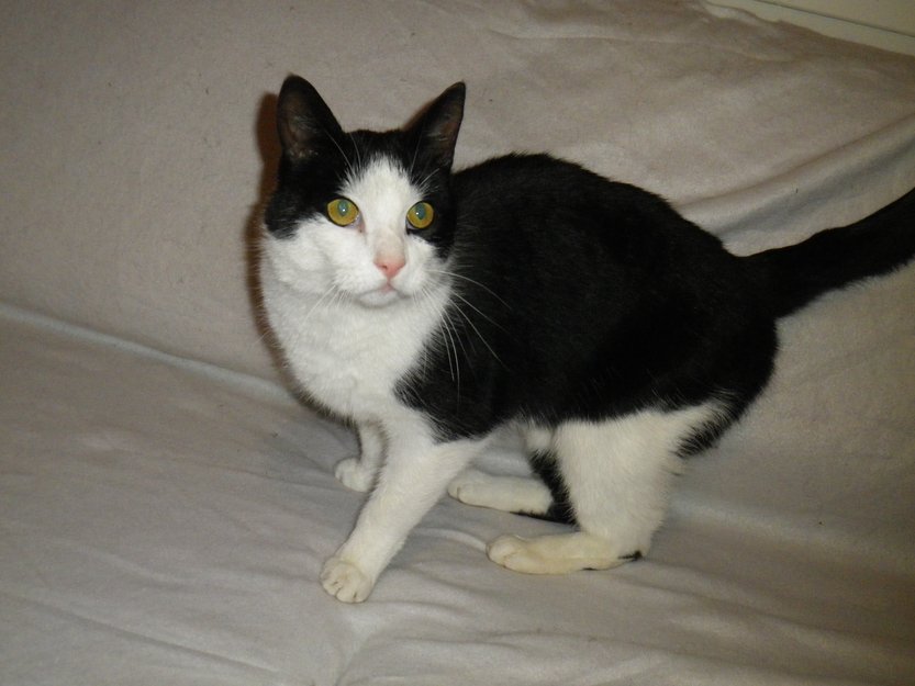 Svart og hvit kastrert hannkatt på ca 4 kg. Vennlig og menneskekjær katt som gjerne hilser på fremmede.
