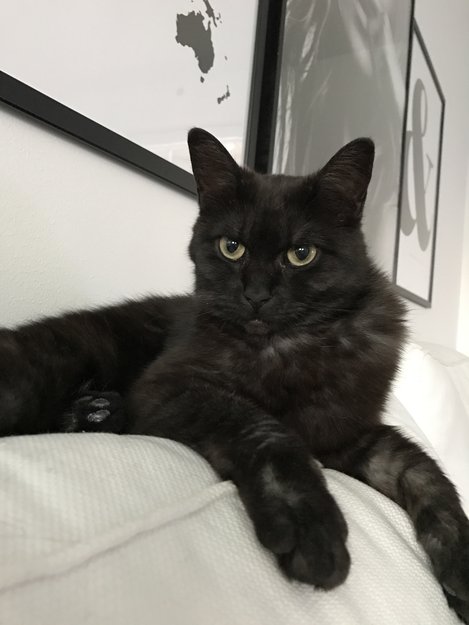 Ronja er brunsvart i pelsen, med undertoner av grått og litt hvit på brystet (se bilde). Hun er ikke noen stor katt, veier ca.3,5kg og skikkelig kosete. Kan være litt sky mot nye mennesker!