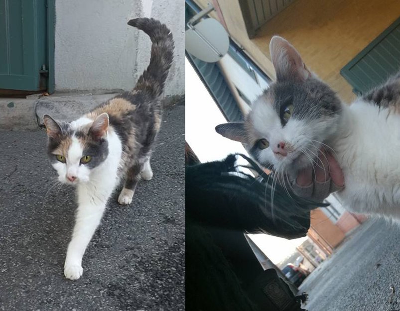 Møtte denne frøkna som var veldig tynn, skitten og rufsete, men samtidig kontaktsøkende og kosete. Ser ut som hun har vært ute et par uker allerede, så jeg bestemte meg for å ta henne med hjem og gi henne mat og husrom mens jeg leter etter eier. Hun er veldig god og snill mot mennesker, så jeg tror hun må ha hatt et hjem før.