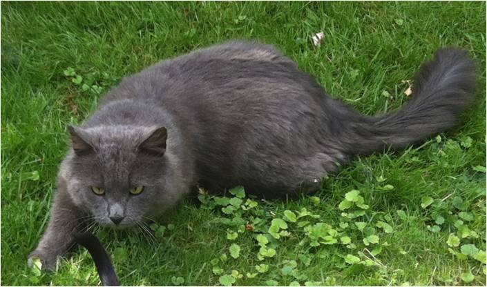 Dukket opp tidlig i sommer på boligfeltet. Usikker på når. Oppsøker folk og hus og har tydlig vært noens huskatt. Kosete, gjør hva som helst for mat og vil gjerne flytte inn.