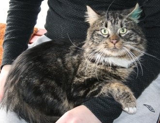 "Værnes" er en semilanghåret hannkatt, i fargene brunsvart tigret, med litt hvit på halsen og potene.