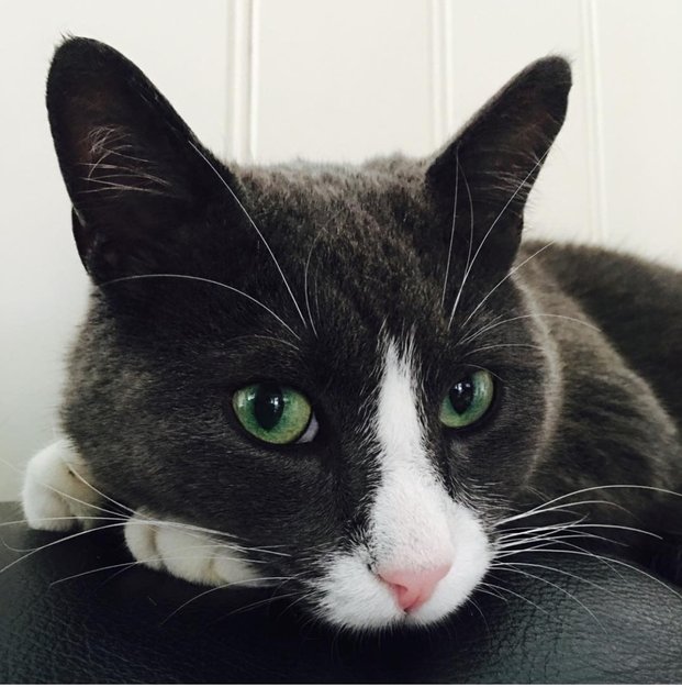 Den er kvit under hals, alle poter er kvite, grønne store auger, Er noko sky for fremmede, lystrer navnet sitt Linus. Har eit lite sår nederst på snuten, høgre side.