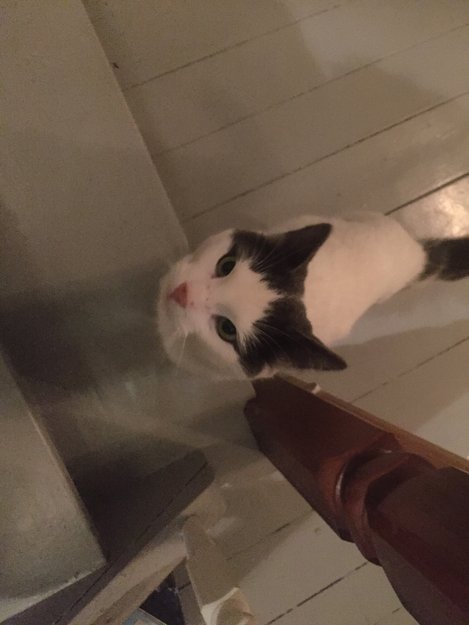 Hvit liten katt med mørk grå ører og hale har slått seg til her etter at snøen kom. Tror det er ganske ung hunkatt. Kontaksøkende, kjælen, snakkesalig og veldig sulten. Har vært her på besøk her tidligere, men vært borte (hjemme ) en stund før den dukket opp igjen tidligere i uken.