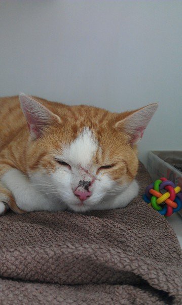 Rød og hvit ukastrert hannkatt savner sine eiere. Han er ca. 1-2 år og har tydeligvis vært ute å sloss, da han hadde en del sår når han kom inn til oss. Han er i godt hold, utrolig kjælen og oppmerksomhetssyk.