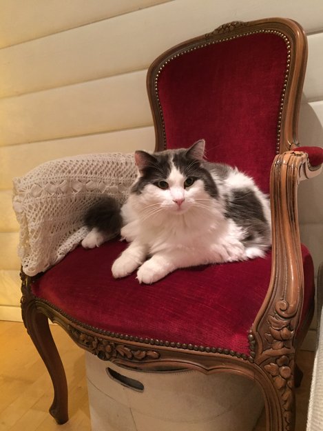 Stor hvit- og gråflekkete langhåret blandingskatt (kastrert hannkatt) med hvitt «bliss» og symmetriske tegninger i ansiktet/på hodet. Store grå flekker på ryggen og flanker, helt hvit pels på magen og labber. Han har ikke halsbånd, men er chippet.