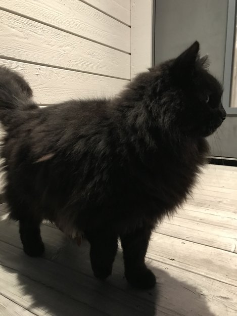 Katten er svart, men har en en brunere nyanse på magen. Den har ikke noe halsbånd, og er ganske så flokete.