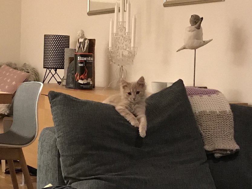 Semilanghåret, rødtigret hunnkatt på 4-5 måneder.