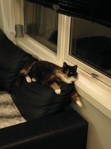 Hun er tricolour, i svart og brun med bittelitt orange enkelte plasser i det brune, og med hvite poter, hvit under hake, hals, deler av brystet og mesteparten av magen. Hun har også svart snute. Missy kom til meg i fra gata for snart 4 år siden, men hu er veldig sky og skvetten for alle andre mennesker enn meg. Hun er chippet og har tatovering i øret.