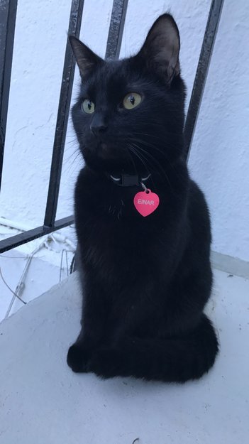 Sort, sett bort frå eit par kvite hår under haka. Sort halsbånd med refleks, og han har nametag med mitt telefonnummer på baksida. Vennleg sjekk kjellerar, garasjer og buder. Han er sårt sakna!