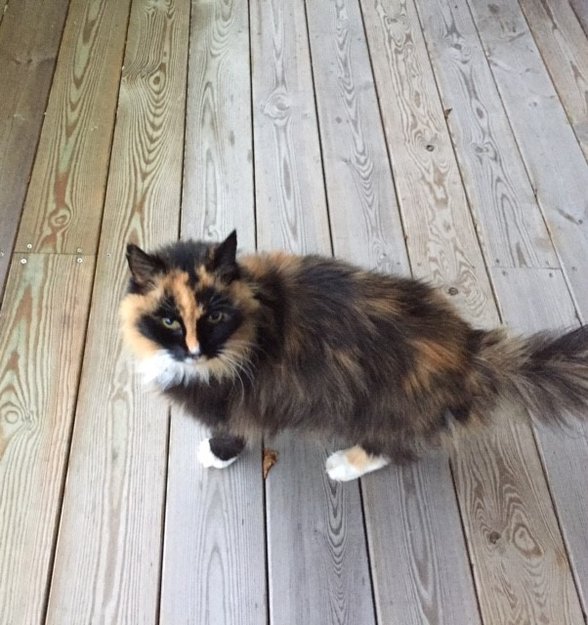 Katten har halsbånd uten info. Den er veldig tynn og tilbringer hele dagen (noen ganger sover over natten) på terrassen.