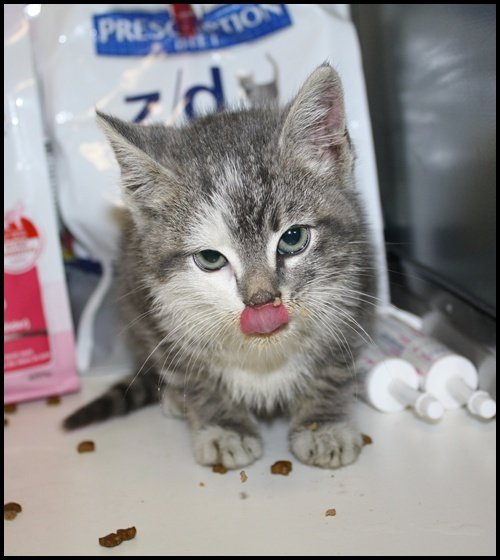 Korthåret liten grå og hvit tigrete kattunge på ca 10 uker.