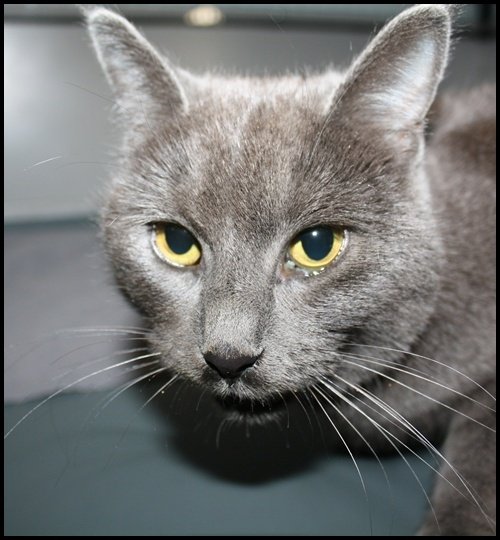 Ung korthåret grå hunnkatt med liten hvit flekk i brystet.