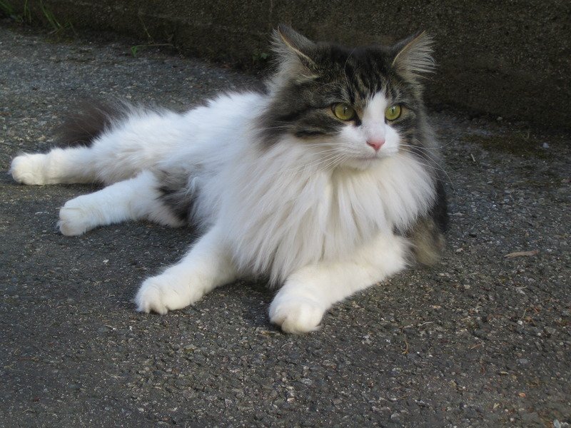 Hvit og svart, litt striper i ansiktet. Langhåret med stor, flott hale.